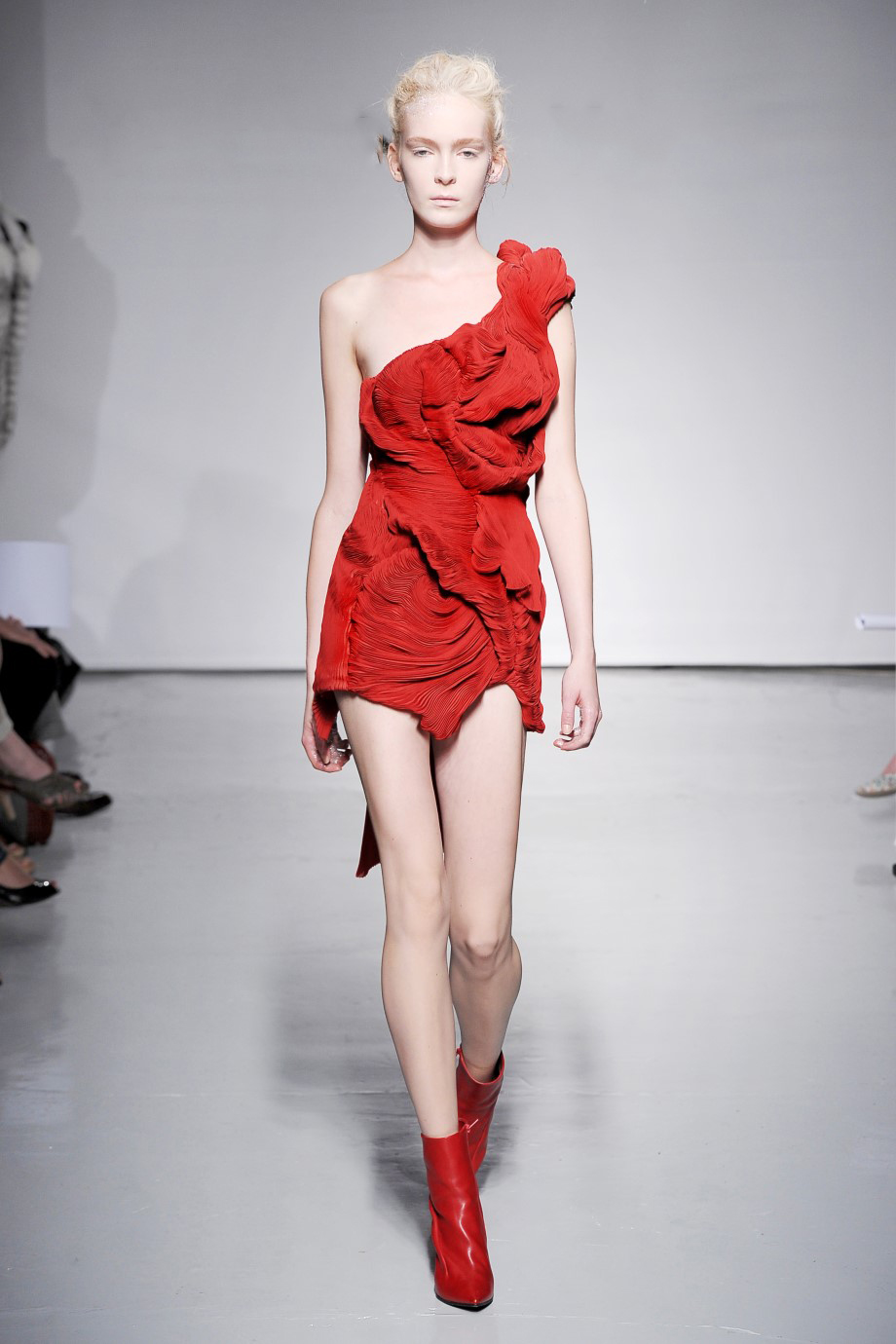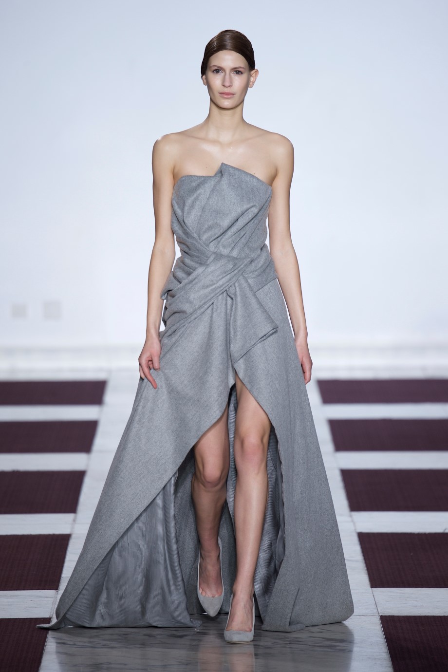Hidden under pleats, her body is revealed when she gets into motion.