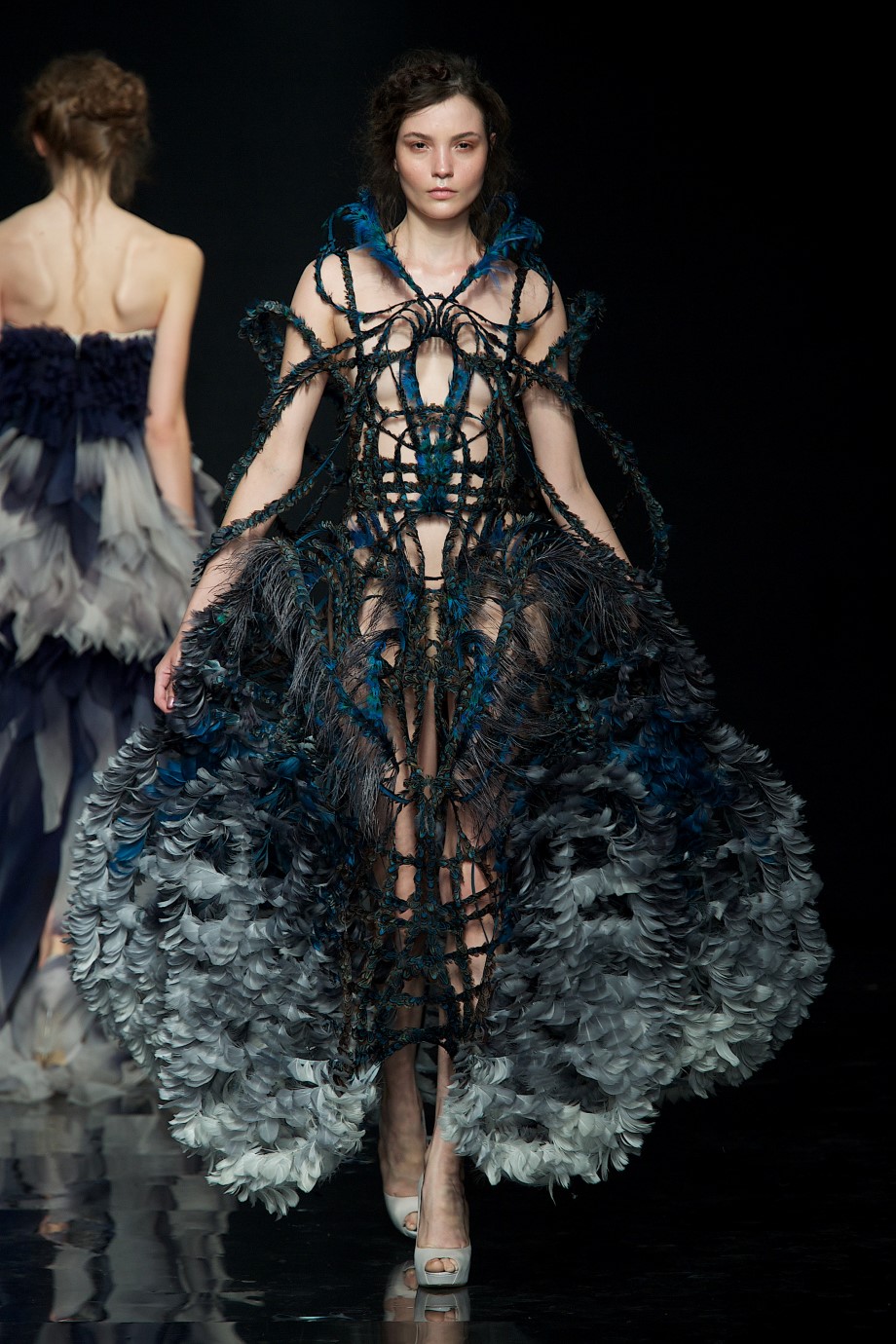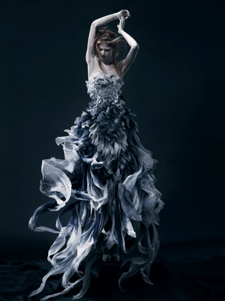 A woman from the depths, dressed in iridescent organza composed of pin tucks cascades. A creature clothed in light from the limbo in her dress made of LEDs and piano strings co-created with sculptor Bastien Carré. A bioluminescent creature mysteriously emerging from the abyss. Where survival rises into the sublime…