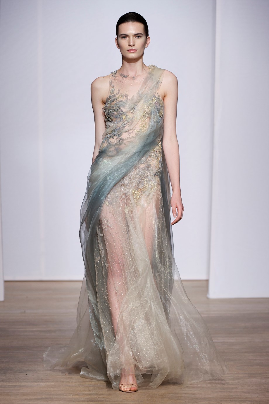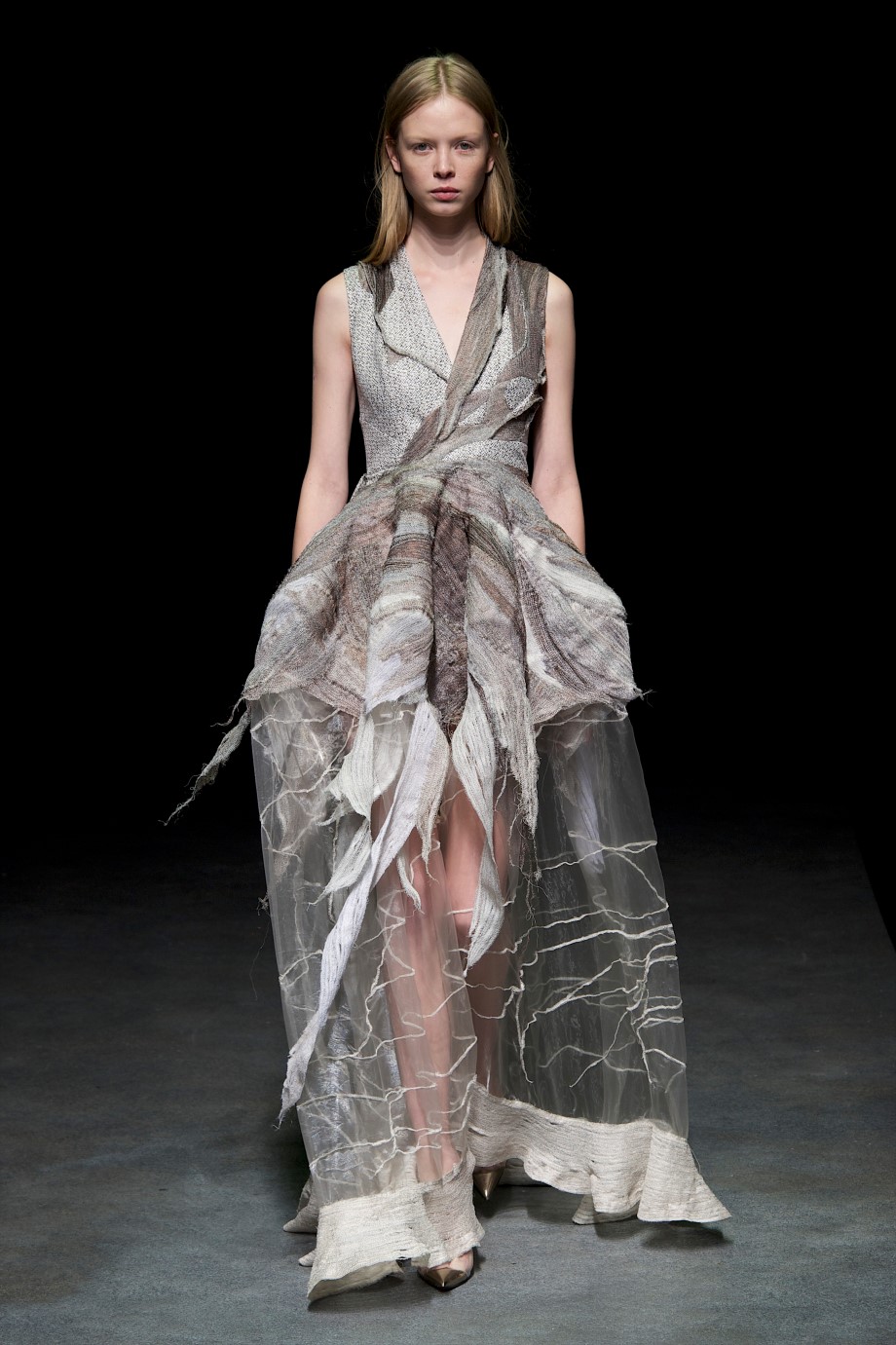 Elegantly pleated organza jerseys naturally create alternating sequences of light and shadows. Long threads flow along the body, or collect in certain areas, rhinestones create strategic connecting points. Tone on tone Swarovski crystals are treated like dust that contaminates and nibbles away at the raw threads. Mineral elements respond to vegetal ones. Everything seems to escape human will yet everything is ordered by that same will.