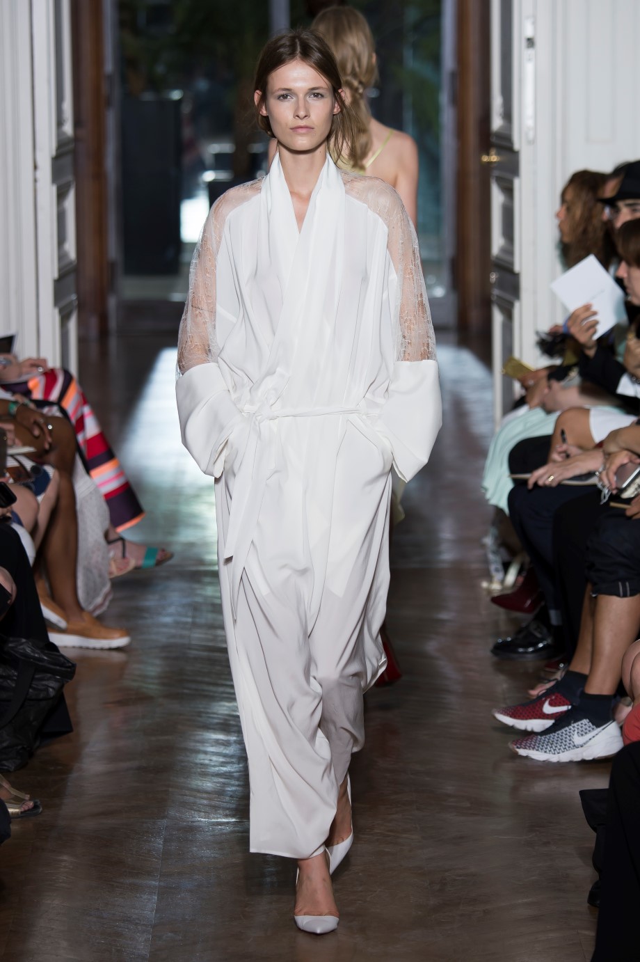 The clothes are sculptures taken to the boundaries of paring, where the search for essentials and the abstraction of gesture converge towards liberation. The drapes are instinctive and thrown in, with fluid washed or liquid silks and alpaca which seem to have been tied around the body, in the simplest fashion, like a casual wrapping process. Fabrics seem to flow like rivers, most naturally. Whereas it isn't so. Everything is under control, right down to the last millimetre, though it does not show. This collection is all about momentum.