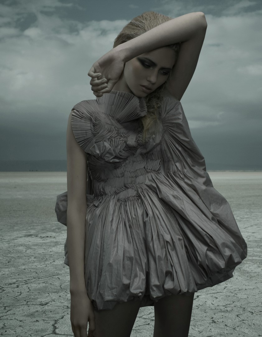 When all must be reinvented, the woman transforms and recovers her lost powers. Sheltered in a fur dress crafted like a mosaic adorned with laser-cut leather scales by textile designer Coen Carsten, she becomes a persona of a mythology yet to be written.
