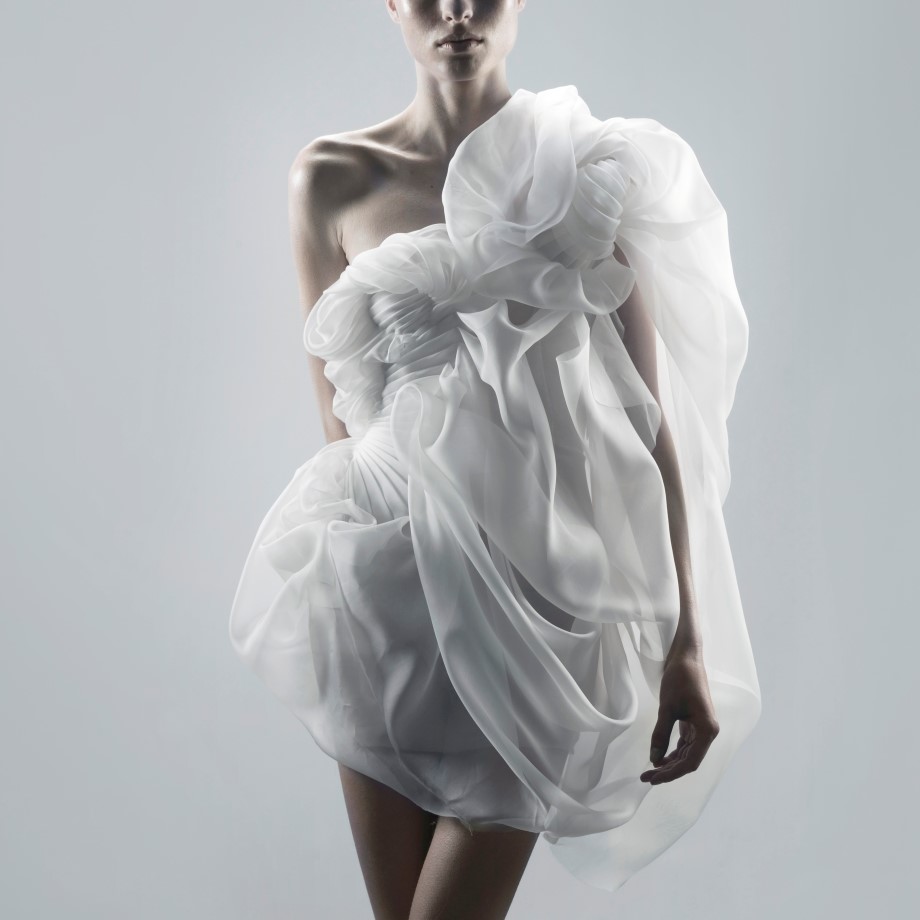 Inspired by artist and architect, Naum Gabo – whose almost immaterial sculptures with parabolic, large volumes occupy space without filling it – her spectacular designer dresses are infinitely graceful, yet unsettling.