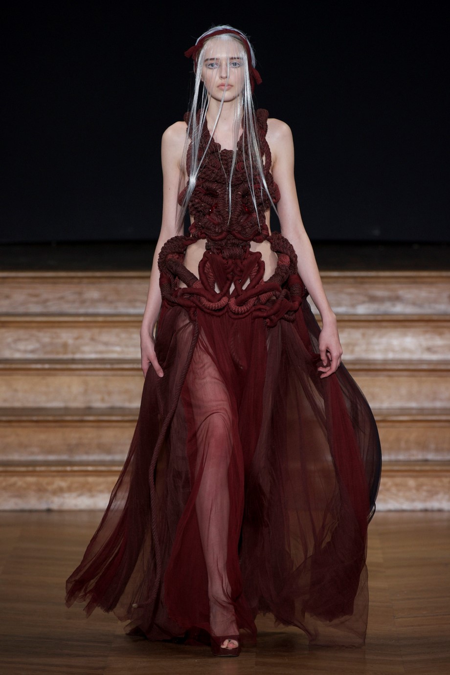 She is a shaman in all her power and apparent fragility, entwined with braided earth red leather harnesses turned into falsely protective bustiers. As she metamorphoses, her skin is laced with fragile lianas made of embroidered branches aspiring to softly constrain her body.